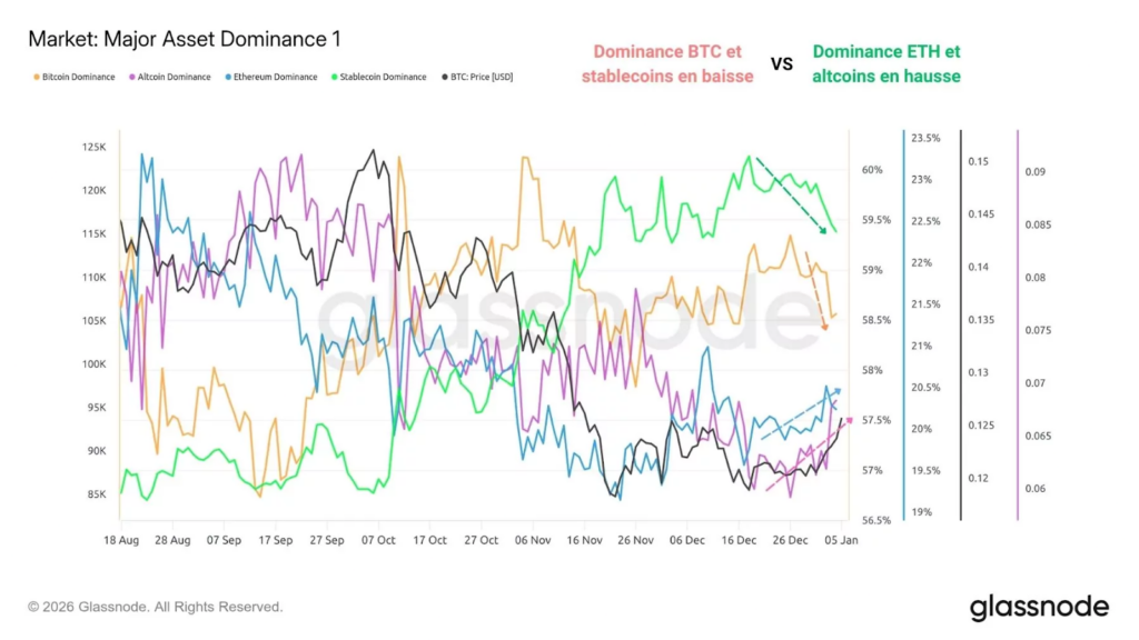 En effet, le BTC et les stablecoins, considérés comme les actifs les moins volatils du marché, ont vu leur dominance chuter au profit de l’ETH et des altcoins.