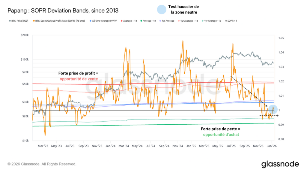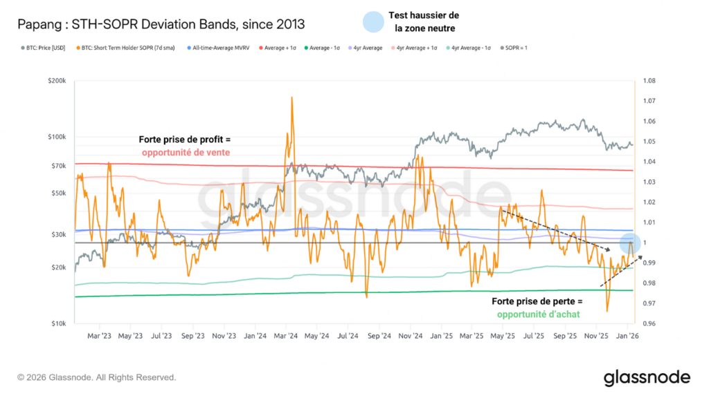 On observe une divergence notable entre la stagnation actuelle du cours du BTC et le ratio STH-SOPR, qui progresse vers 1 après avoir enregistré un pic de prise de perte majeur fin novembre 2025.