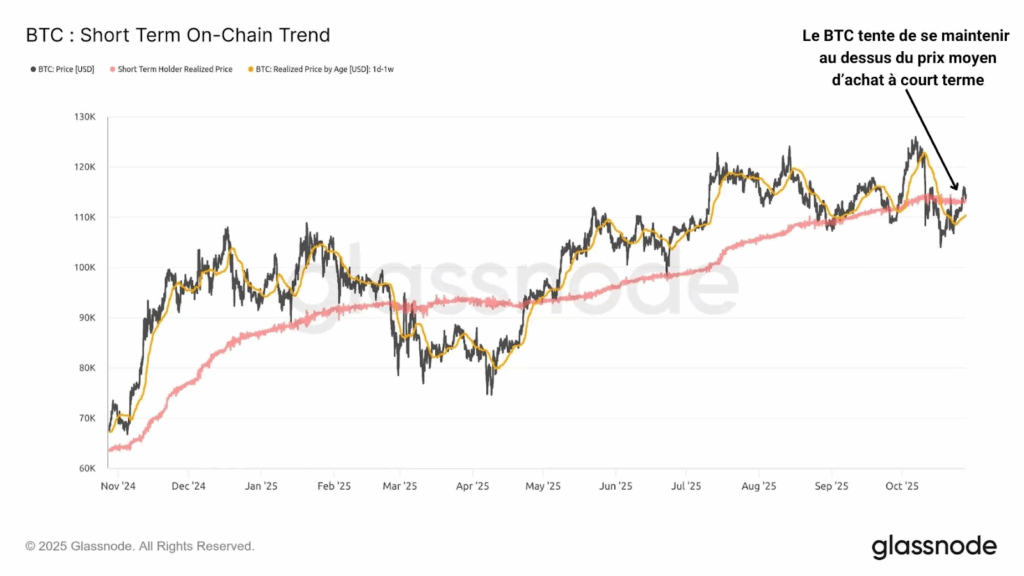Durant cette reprise, le cours du Bitcoin est parvenu à se hisser au-dessus du prix moyen d’achat des investisseurs à court terme (STH), estimé à près de 113 000 $.