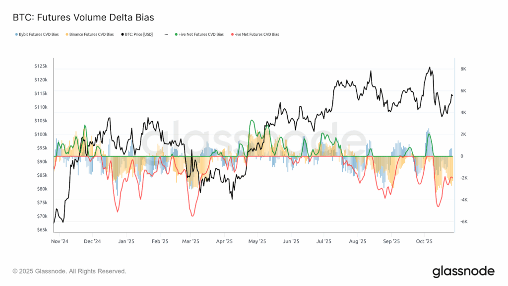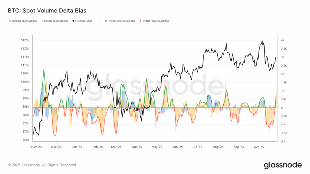 Les marchés spot repassent légèrement acheteurs, mais volumes faibles (~500 BTC/jour) → demande insuffisante pour une forte continuation haussière.
